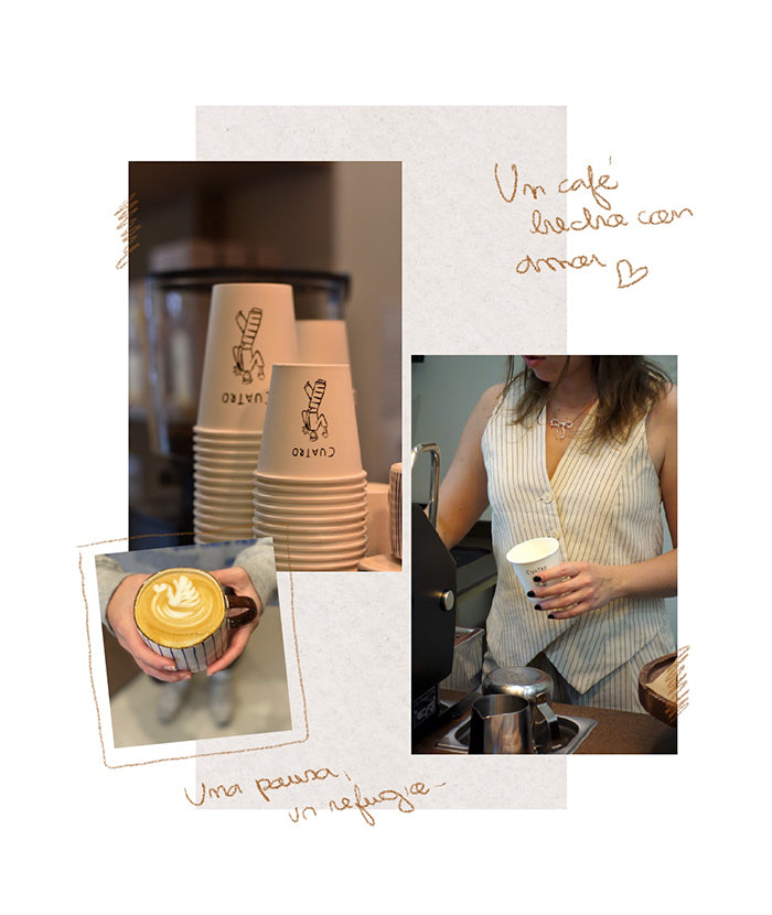 Si Cuatro Cafecito fuera un look, sería algo casual, cómodo y sencillo. Un look con colores neutros que te haga sentir en casa. Creo que esa combinación refleja perfectamente cómo me siento en el café y la armonía de su diseño. El look sería un equilibrio perfecto entre comodidad y estilo, un reflejo de nuestra filosofía.